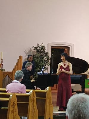 Beim Abstecher in die „mélodies francaises“ mit Fauré und Debussy, die gerne Texte ihres Zeitgenossen Paul Verlaine mit Musik unterlegten, trug Vera das Gedicht "Green“ vor. Worte, die Verlaine nach der Trennung von seiner Frau in England schrieb und die beide vertonten, wobei bei Fauré die Romantik und bei Debussy impressionistische Noten durchklingen.