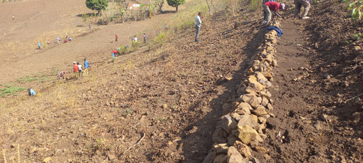 Training für die Bauern bedeutet Sensibilisierung für notwendige Wiederaufforstungsarbeiten. Dass überweidete Flächen besonders erosionsgefährdet sind, haben verheerende Erdrutsche in den vergangenen Jahren schon deutlich gemacht. Vor der Regenzeit, die in der Boreda Region von Juni bis Oktober dauert, wurden in den Schutzgebieten Hänge mit Erd- und Steinwällen stabilisiert. Momentan werden Setzlinge eingepflanzt. Im Frühling können die belgischen Besucher dann überprüfen, wie die Anpflanzungen gedeihen.